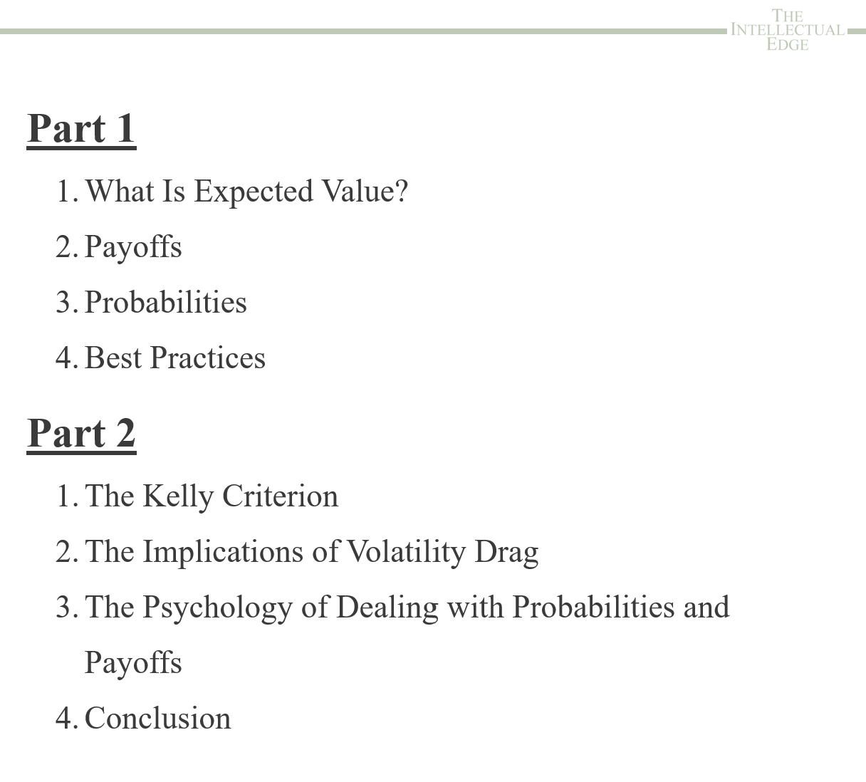 Today we’re going deeper into expected value, it’s a large topic that deserves its own series; I promise you, the quality of your decisions can be improved by it.